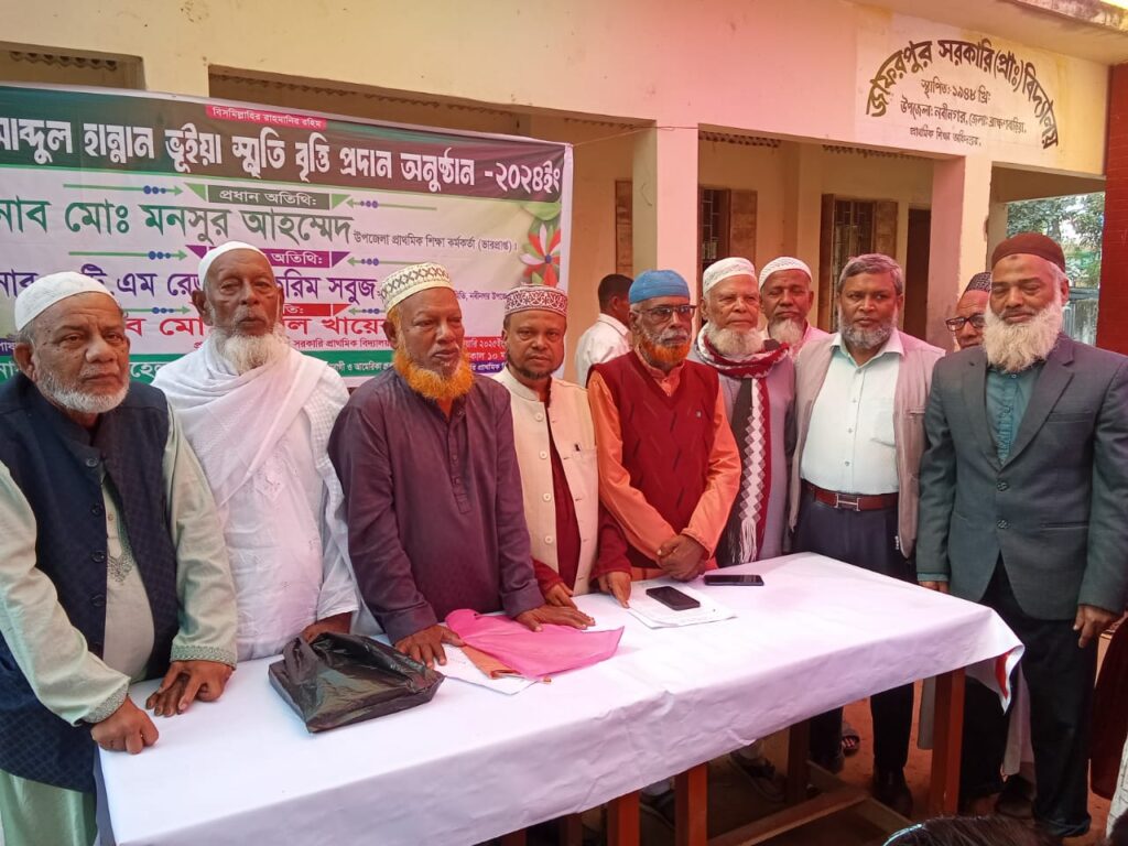 মোঃ শাহ আলম খন্দকার ও এখলাছ উদ্দিন পিন্টুর যৌথ প্রতিবেদন ঃ ১৩ই ফেব্রুয়ারি বৃহস্পতিবার ২০২৫ ইং সকাল ১০ ঘটিকায়ব্রাহ্মণবাড়িয়ার নবীনগর উপজেলার ইব্রাহিমপুর ইউনিয়নের জাফরপুর সরকারি প্রাথমিক বিদ্যালয়ে মরহুম আব্দুল হান্নান ভূঁইয়ার স্মৃতিবৃত্তি প্রদান করা হয়।জাফরপুর সরকারি প্রাথমিক বিদ্যালয় মরহুম আব্দুল হান্নান ভূঁইয়ার স্মৃতি বৃত্তি পরীক্ষায় নবীনগর উপজেলা ২৭টি সরকারি প্রাথমিক বিদ্যালয়ে সর্বমোট-১২৫ জন ছাত্র-ছাত্রী পরীক্ষায় অংশগ্রহণ করেছিল A গ্রেডে১০ জন ছাত্র-ছাত্রী সাধারণ গ্রেডে ১৫ জন ছাত্র- ছাত্রী পরীক্ষায় উত্তীর্ণ হয়েছে। উত্তীর্ণদেরকে পুরষ্কার বিতরণ করা হয়।