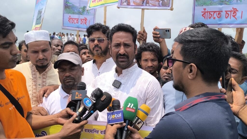 এসময় বক্তারা বলেন, বিগত ১৫/২০ বছরে এ অঞ্চলে প্রায় ৫০হাজার পরিবারের বশত বাড়ি, সরকারী স্থাপনা, মসজিদ, মাদ্রাসা, বাপ-দাদার কবরস্থান, মৎস খামার, গরু মহিষের খামার, ফসলী জমি নদী গর্ভে বিলীন হয়ে গেছে। ১লক্ষ লোক নিঃস্ব হয়ে গেছে। আগামী অল্প কিছু দিনের মধ্যে ক্রসড্যাম নির্মাণ, ৫ কিলোমিটার ব্লক দেওয়া ও চাপরাশি খালের মুখে স্লুইসগেট খুলে দেওয়া না হলে চরএলাহী ইউনিয়নের চরএলাহী বাজার, চরএলাহী উচ্চ বিদ্যালয়, চরএলাহী সরকারী প্রাথমিক বিদ্যালয়, স্বাস্থ্য কমপ্লেক্স, ভূমি অফিস, মসজিদ, মাদ্রাসাসহ সকল স্থাপনা নদী গর্ভে বিলীন হয়ে যাবে। মানববন্ধনে হাজার হাজার মানুষ অংশগ্রহণ করে।