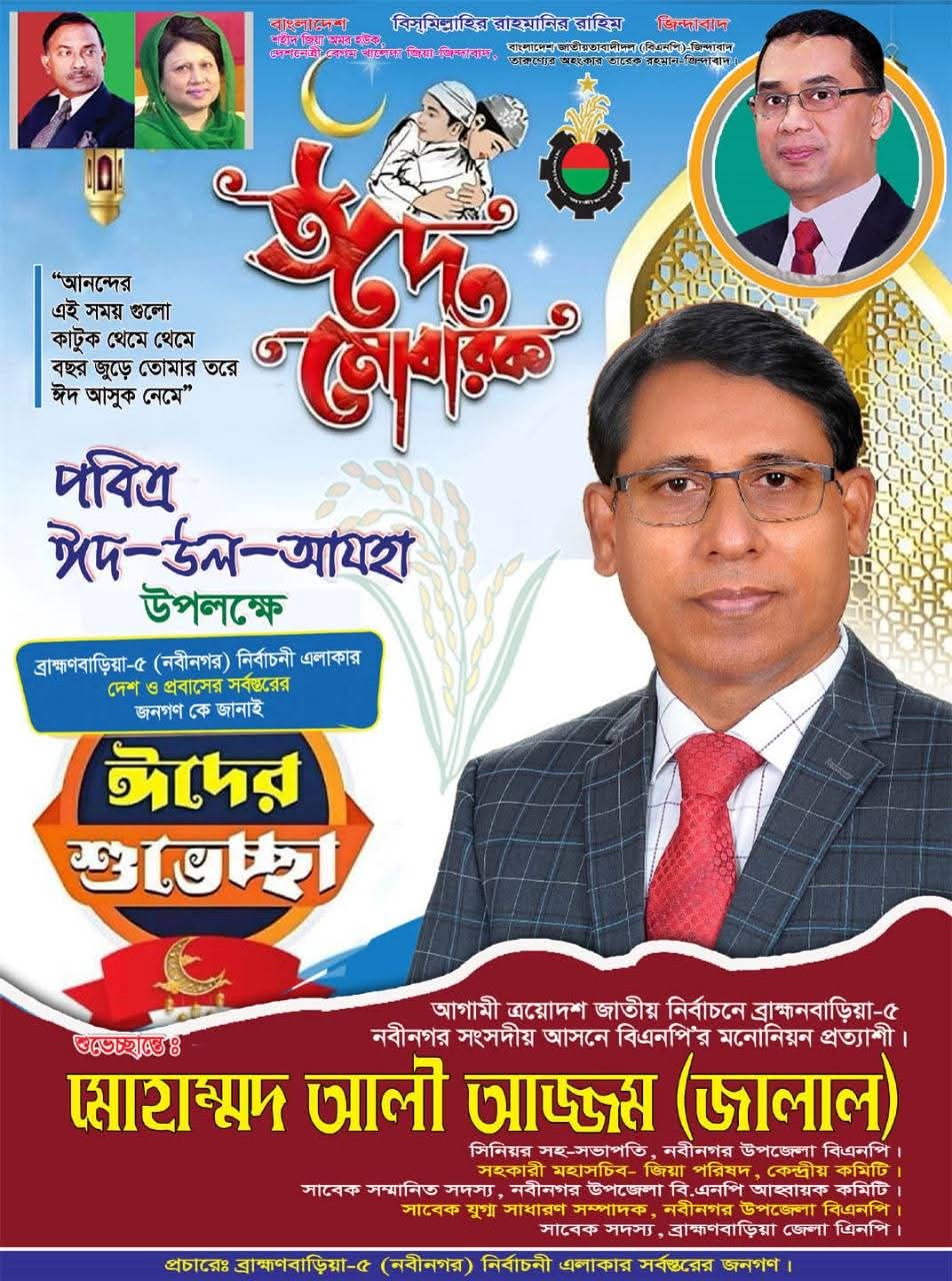 নবীনগর বাসীকে পবিত্র ঈদুল আযাহার শুভেচ্ছা জানিয়েছেন, বিএনপি নেতা আলী আজ্জম জালাল
